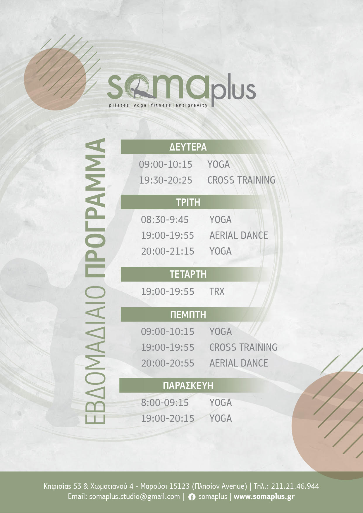Όποιος και αν είναι ο στόχος σας, το πλήρως εξοπλισμένο studio του Somaplus, με μηχανήματα της balanced body, ιμάντες, mats, hammocks και όλα τα σύγχρονα όργανα άσκησης, σε ένα μοντέρνο και υψηλών προδιαγραφών και αισθητικής χώρο, προσφέρει ολιγομελή ομαδικά και ατομικά προγράμματα που καλύπτουν τις ανάγκες κάθε ηλικίας και φυσικής κατάστασης.